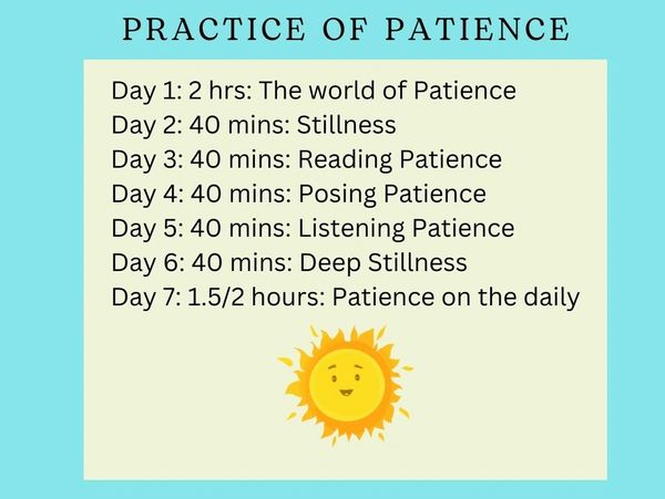 It happens over 7 days (Sunday to Saturday). A total of 7 hours are spent over 7 days. The first day of the workshop is aimed at glancing into the world of patience as we have experienced it so far. This day serves as the basis for the next 5 days of the practice. Over the next 5 days, we physically practice patience (40 mins per day) in different ways, without speaking about it (that too can be a test of patience!). Finally, Day 7 helps us make sense of the practice we did. This day particularly focuses on taking home 'patience' in a more tangible way that can be practiced in your routine life. These sessions will not be recorded.