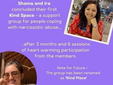 Kind Place is a support group for individuals coping with Narcissistic abuse. The first group held space for 7 members and 2 facilitators. This group was held over 6 sessions from May to July 2024.