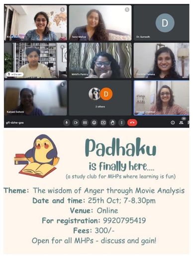 Padhaku is a study club for MHPs with the aim of learning in a creative and affordable way. The first session was held on 25 Oct 2023. As a group we made excellent reflective points about the emotion of anger (through movie analysis) from a personal, therapeutic, political, inter-generational and experiential perspective.